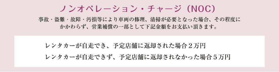 | NOC対応 | 著しい臭気・汚損・破損などにより車両の修理が必要となった場合は、NOCをお支払いいただきます。 | |